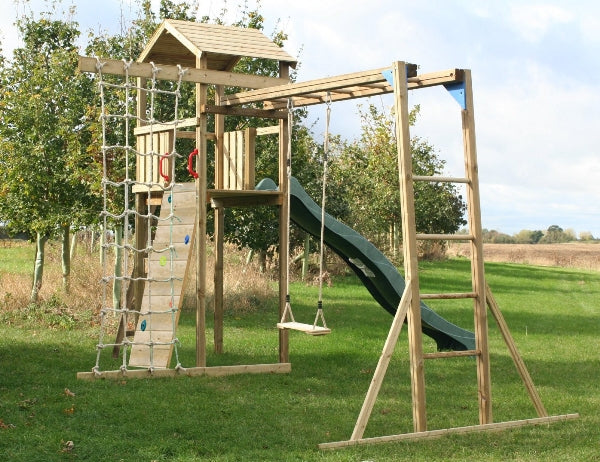 Around a spacious roofed wooden tower measuring 90cm x 120cm is every feature imaginable for children who love to climb and explore. Positioned around the compact frame are monkey bars with rounded rungs, a commando net, a climbing wall and a pine wood swing. A ladder is also included for a less energetic way to access the tower!