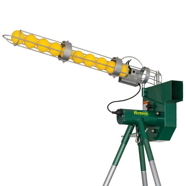 It includes an automatic 12 ball feeder and is sold including a box of 12 regular Paceman balls although it is compatible with the light and junior Paceman ball as well. Please note only Paceman balls must be used with the Paceman Pro for safety and performance.