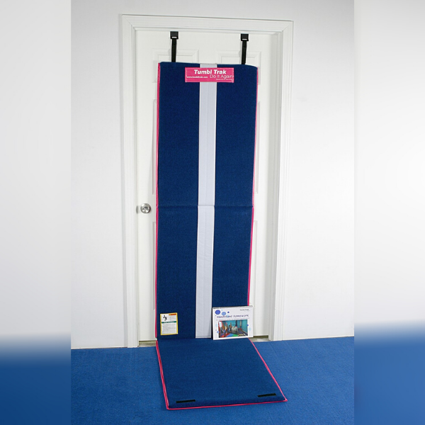 The handstand homework mat is reversible. One side is a cartwheel mat (available in four colours) and the other side is a blue carpet which features a 1.8m long 10cm wide white "beam" stripe.